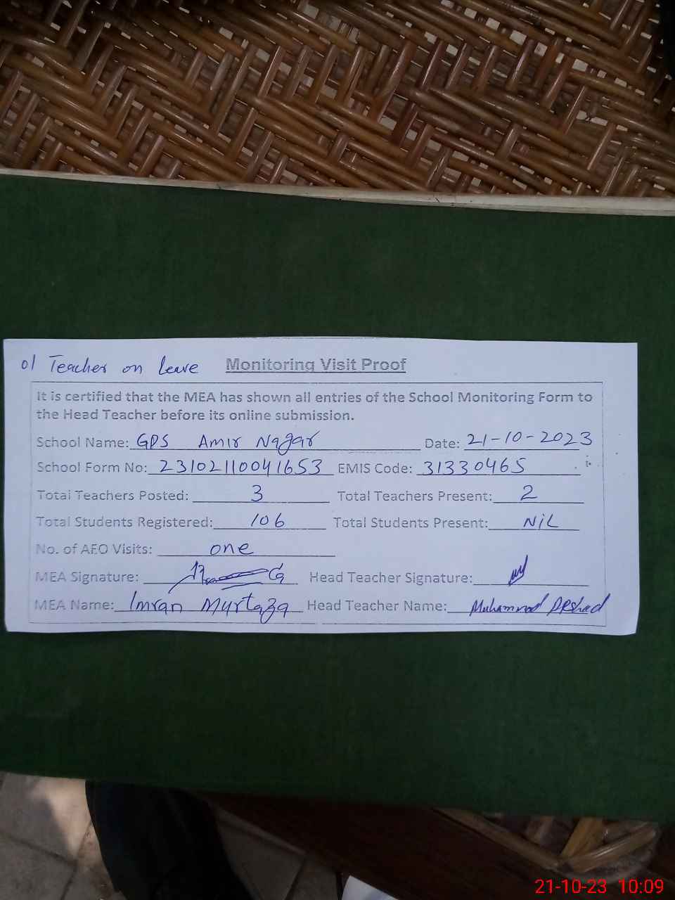 | Monitoring Date: 21-10-2023 | Start Time: 21-10-2023 09:46 AM | End Time: 21-10-2023 10:09 AM | Name of MEA: Im**** Mu**** | |