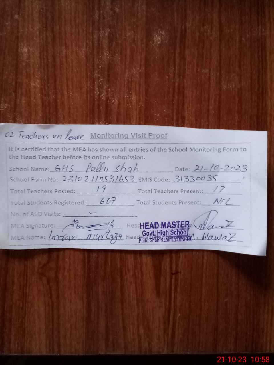 | EMIS Code: 31330035 | Name of School: GHS PULLO SHAH | |||
