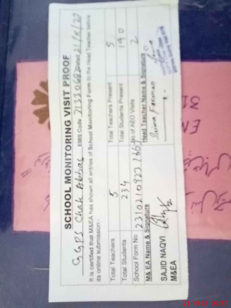 | Attendance Register | Head Teacher | MEA with School | Visit Proof |