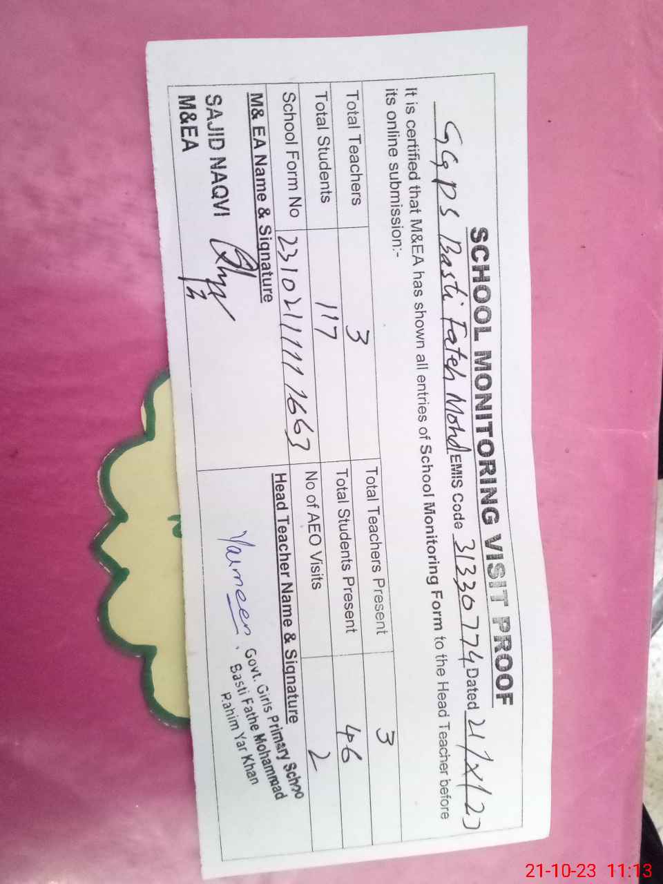 | EMIS Code: 31330774 | Name of School: GGPS BASTI FATEH MUHAMMAD | |||