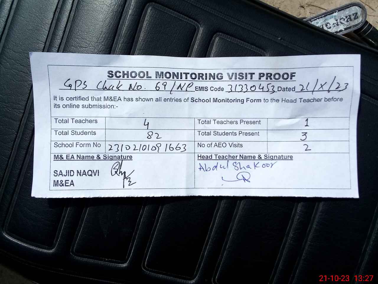 | Attendance Register | Head Teacher | MEA with School | Visit Proof |