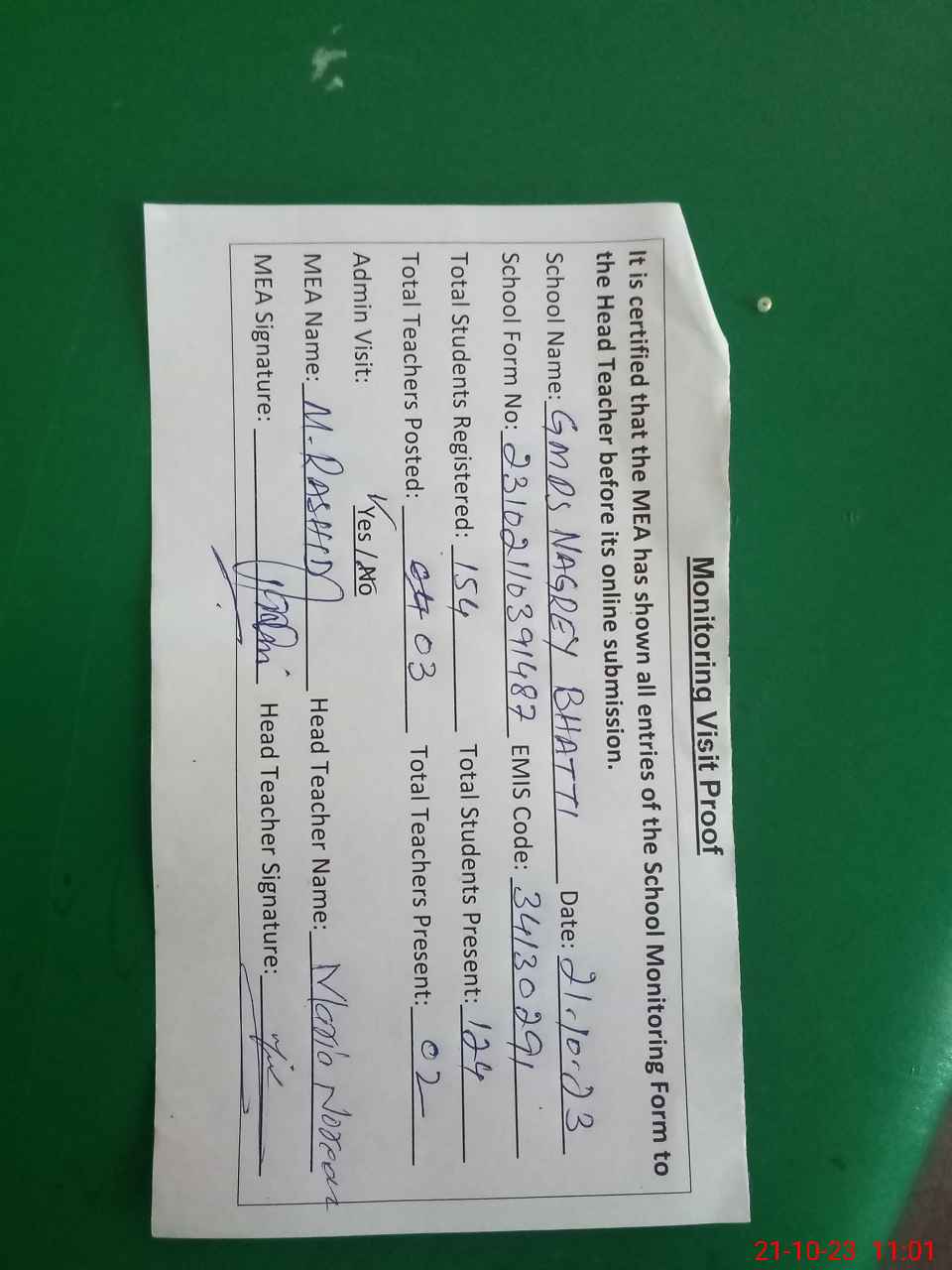 | EMIS Code: 34130291 | Name of School: GMPS NAGREY BHATTI | |||