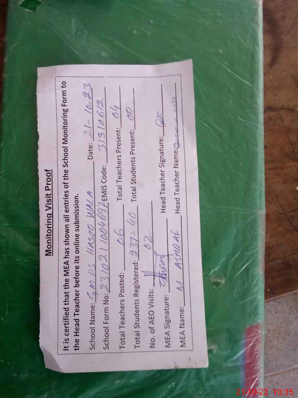 | EMIS Code: 31310612 | Name of School: GMPS HASOO WALA (After Noon) | |||