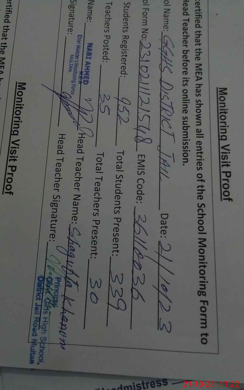 | EMIS Code: 36110036 | Name of School: GGHS DISTRICT JAIL ROAD MULTAN | |||