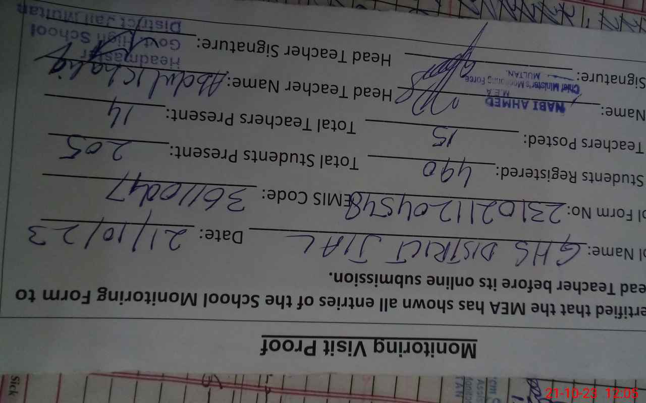 | EMIS Code: 36110047 | Name of School: GHS DISTRICT JAIL MULTAN | |||