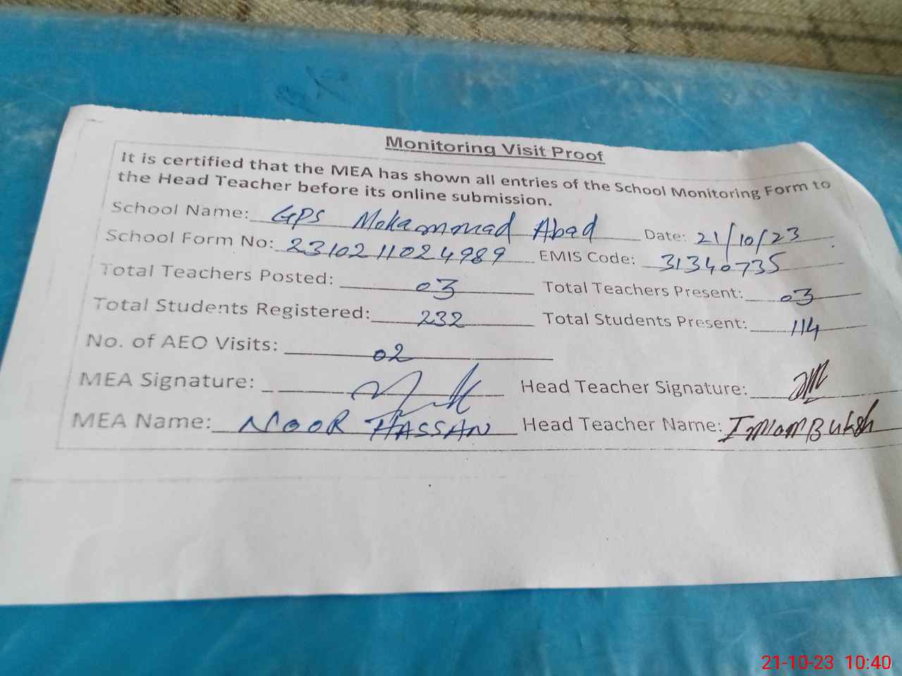 | EMIS Code: 31340735 | Name of School: GPS MUHAMMAD ABAD | |||