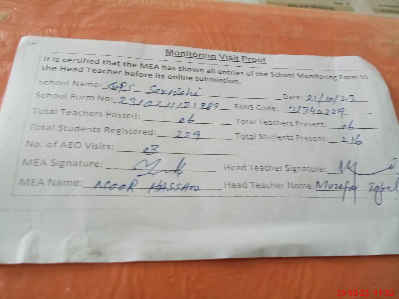 | Attendance Register | Head Teacher | MEA with School | Visit Proof |