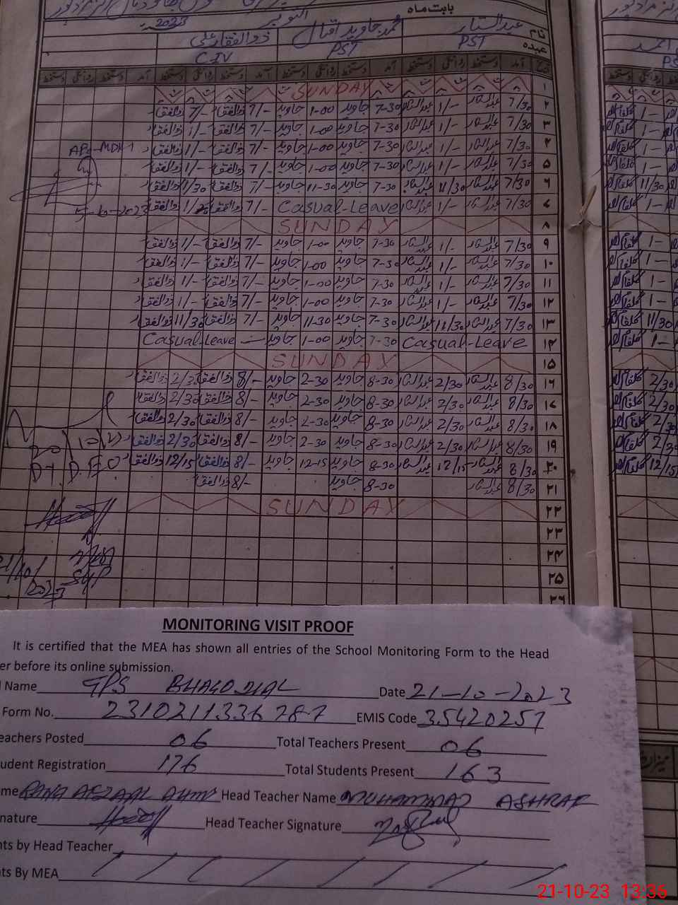 | Attendance Register | Head Teacher | MEA with School | Visit Proof |