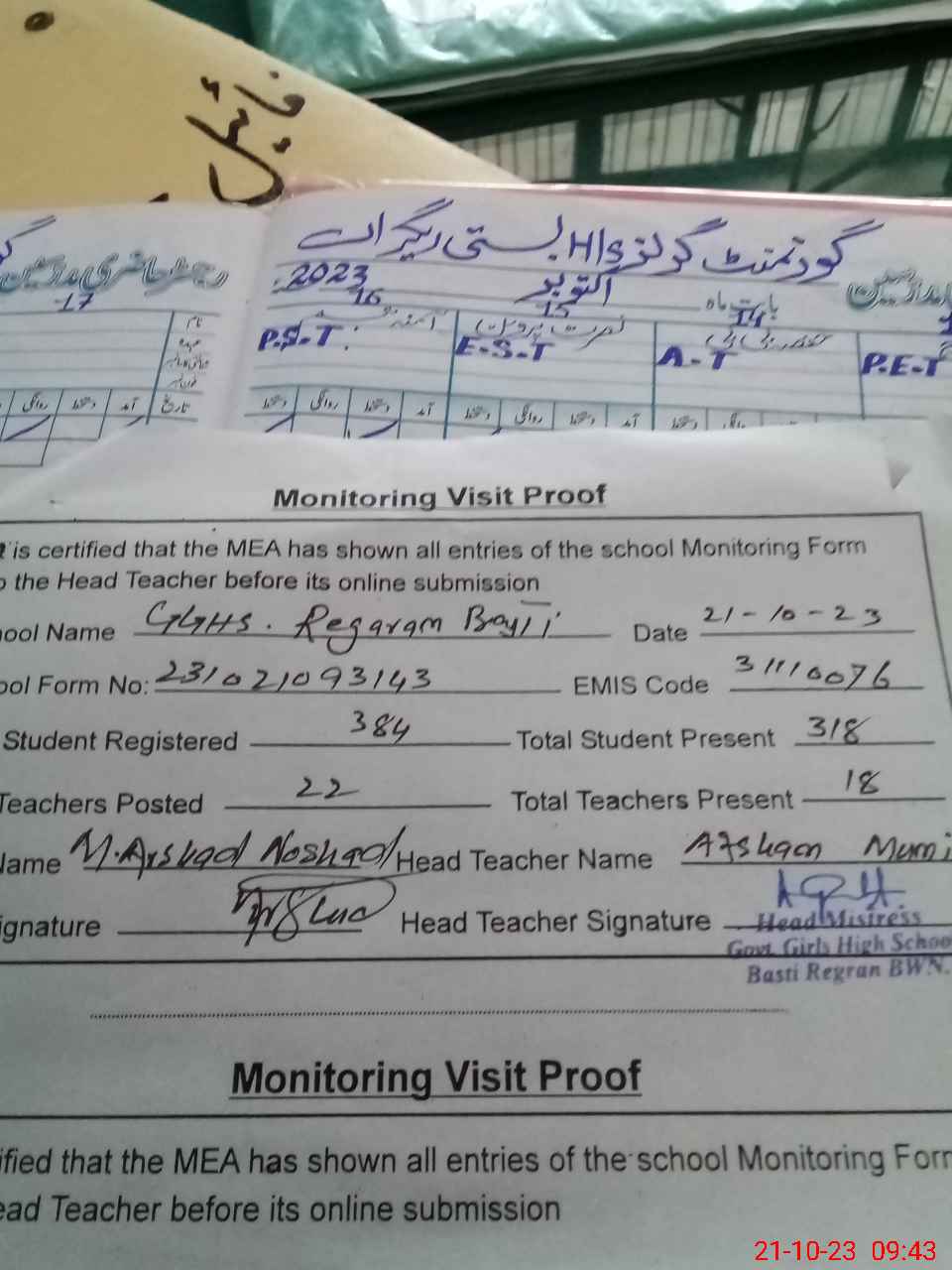 | Attendance Register | Head Teacher | MEA with School | Visit Proof |