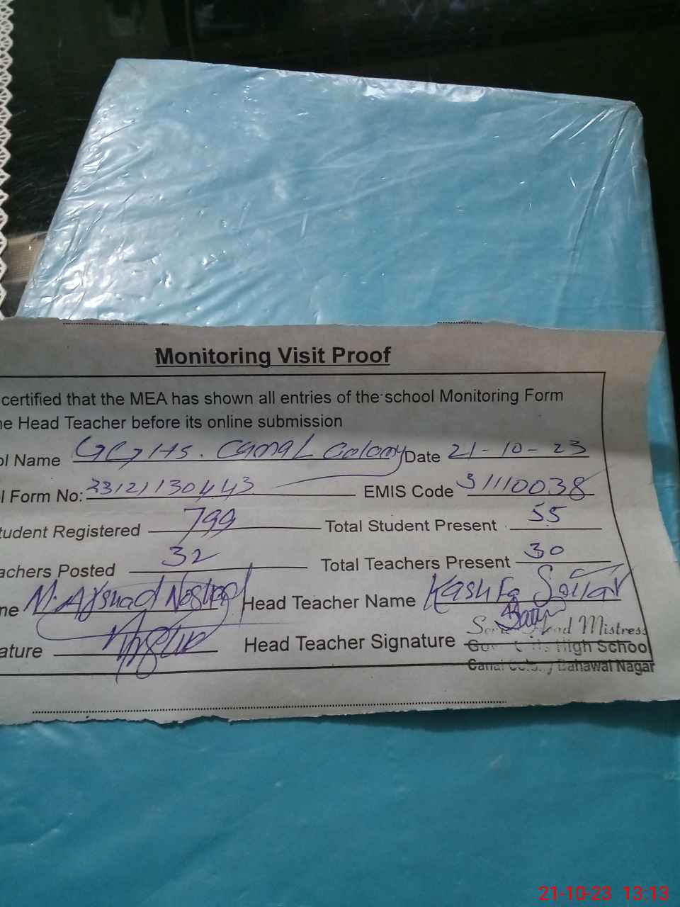 | Attendance Register | Head Teacher | MEA with School | Visit Proof |
