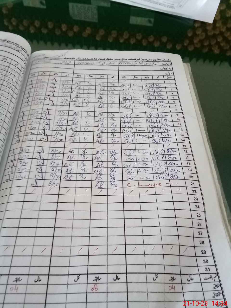 | CNIC | Full Name | Designation | R/C | Absence during last cal. month |