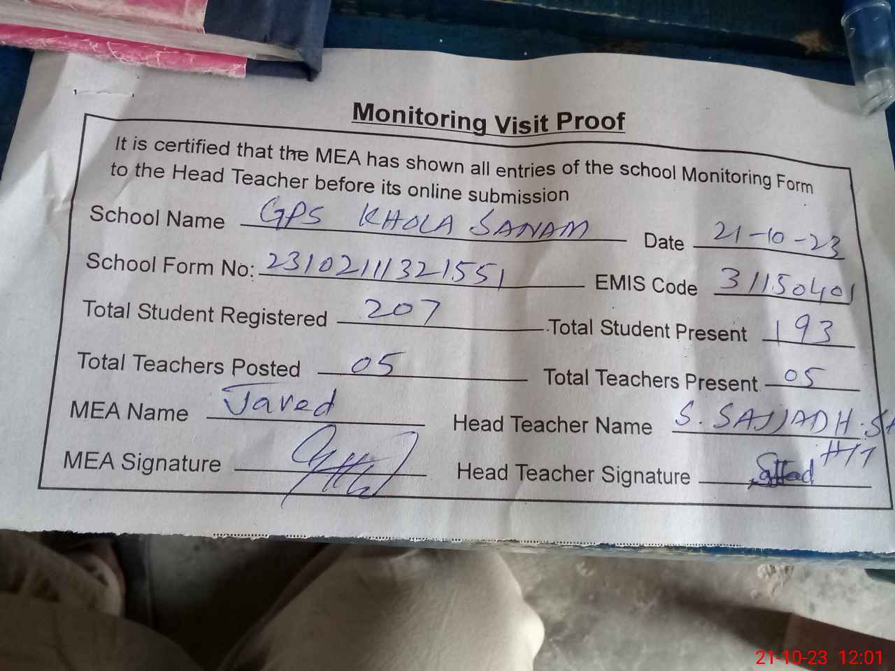 | Attendance Register | Head Teacher | MEA with School | Visit Proof |
