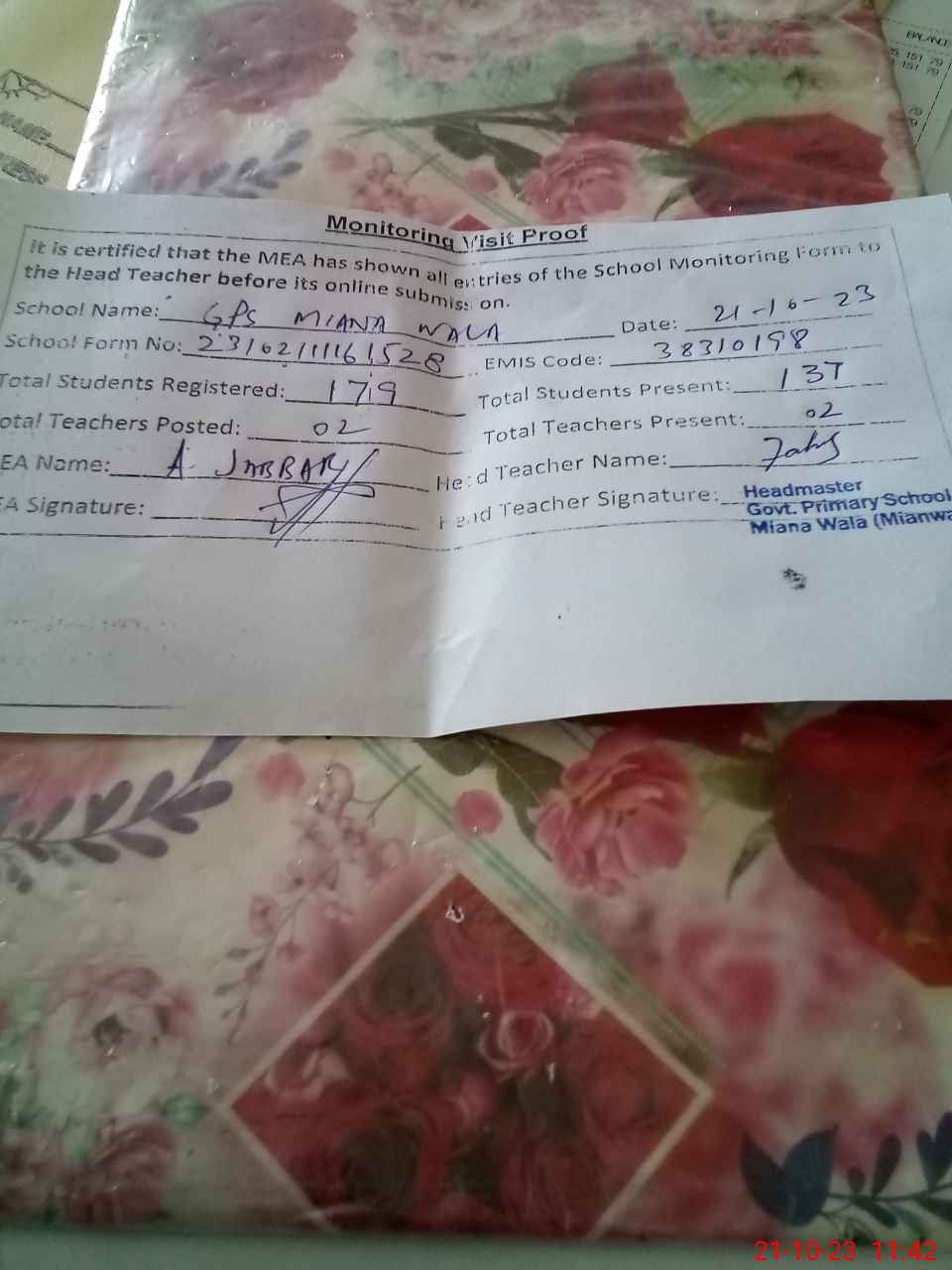 | EMIS Code: 38310198 | Name of School: GPS MIANA WALA | |||