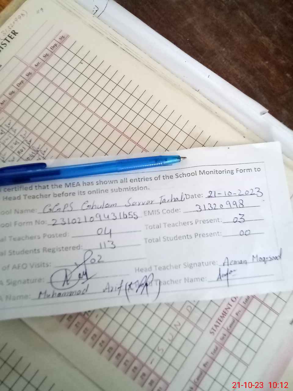| EMIS Code: 31320998 | Name of School: GGPS GHULAM SARWAR TARHALI | |||