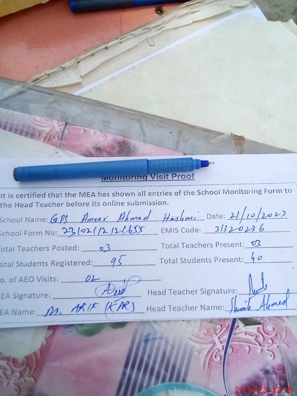 | Attendance Register | Head Teacher | MEA with School | Visit Proof |