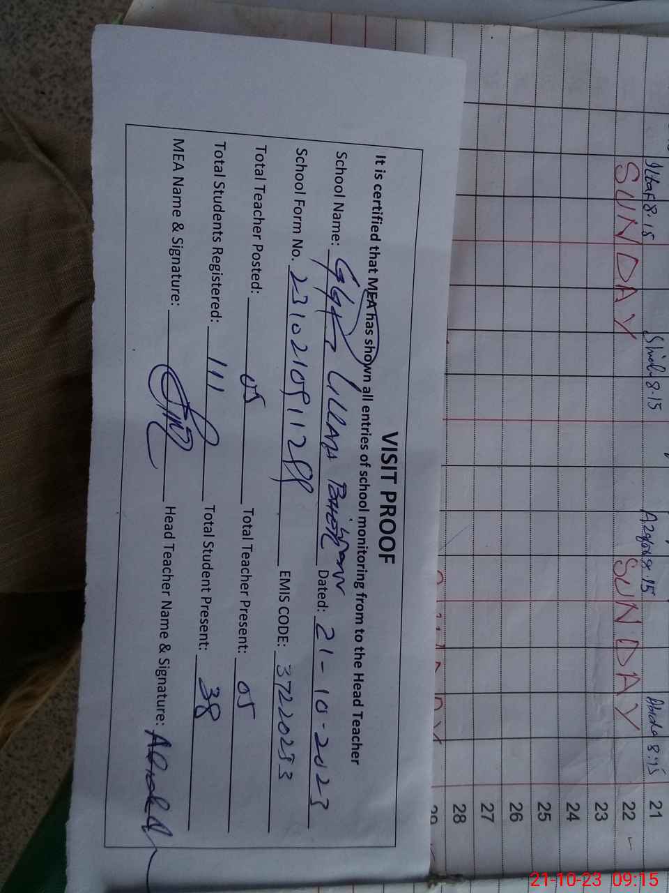 | Attendance Register | Head Teacher | MEA with School | Visit Proof |