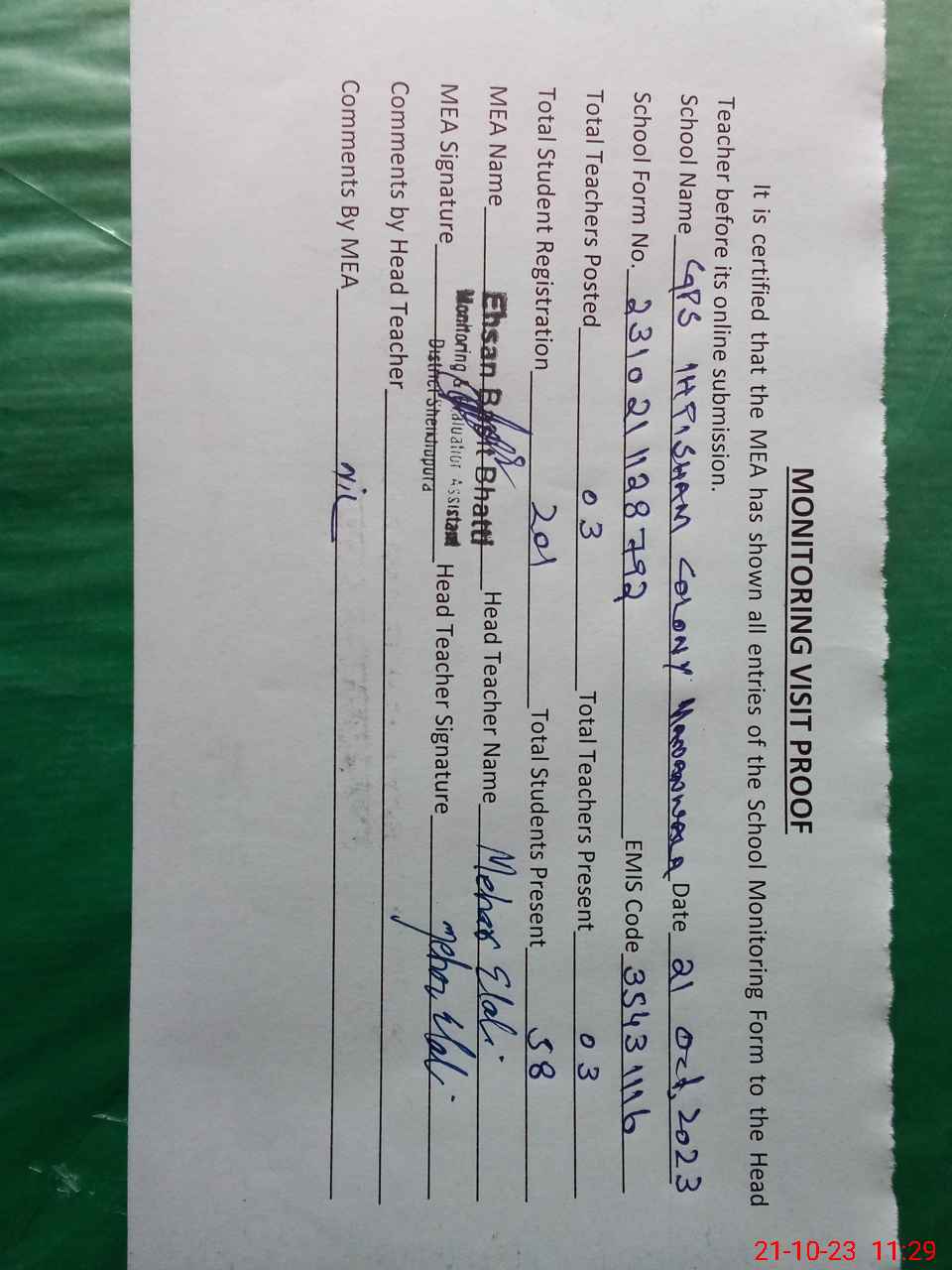 | EMIS Code: 35431116 | Name of School: GPS IHTISHAM COLONY MANANWALA | |||