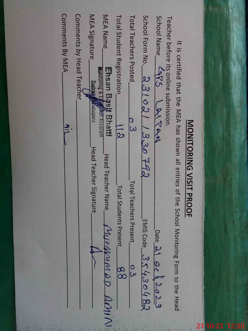 | Certified that this School was Inspected by the Undersigned MEA/DMO Today and the Information Stated Above is as Per Record. | |||||