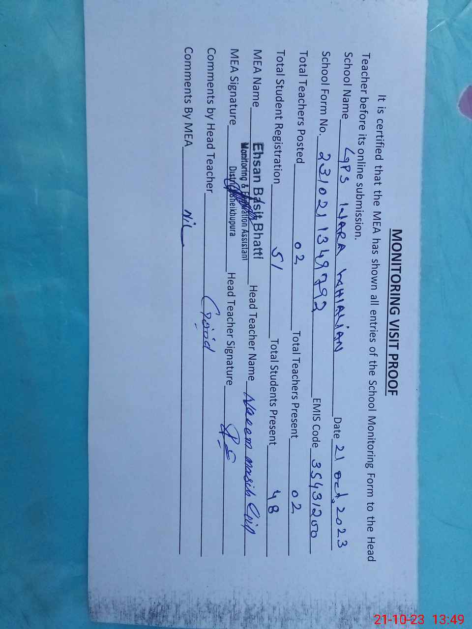 | Attendance Register | Head Teacher | MEA with School | Visit Proof |