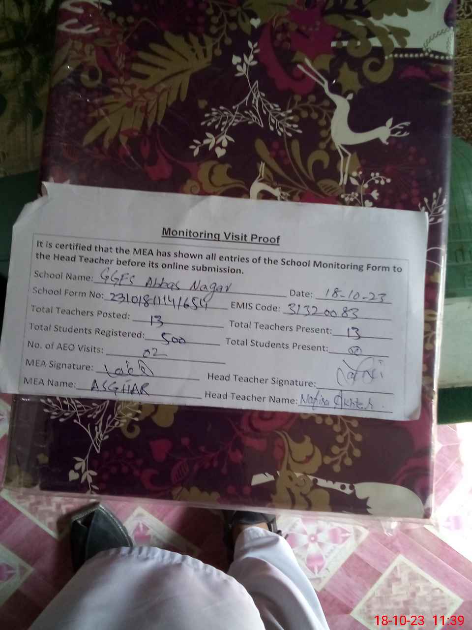 | Attendance Register | Head Teacher | MEA with School | Visit Proof |