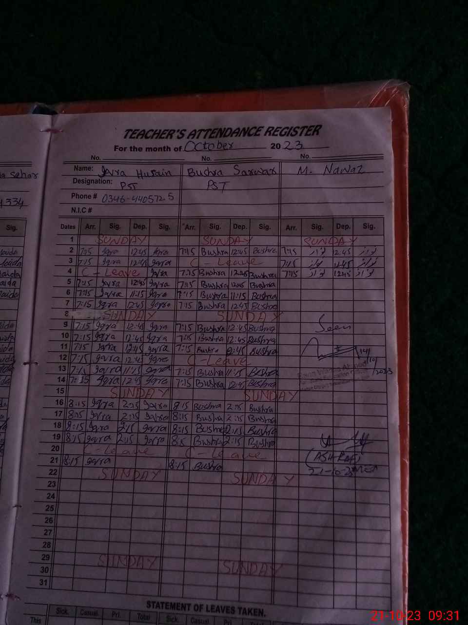 | CNIC | Full Name | Designation | R/C | Absence During Last Calender Month |