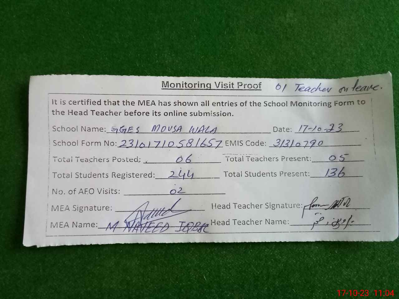 | Attendance Register | Head Teacher | MEA with School | Visit Proof |