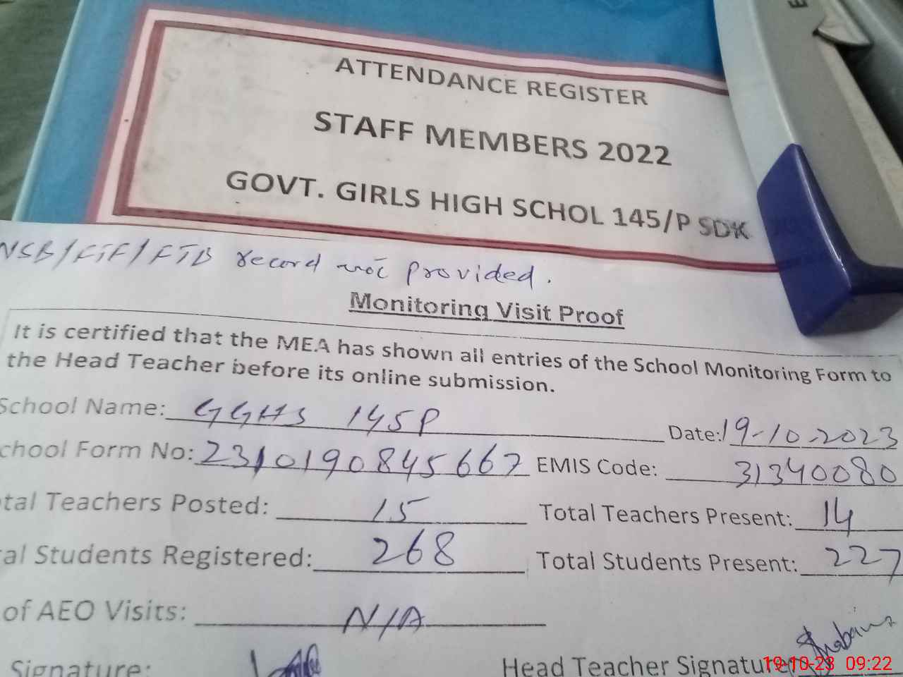 | Attendance Register | Head Teacher | MEA with School | Visit Proof |