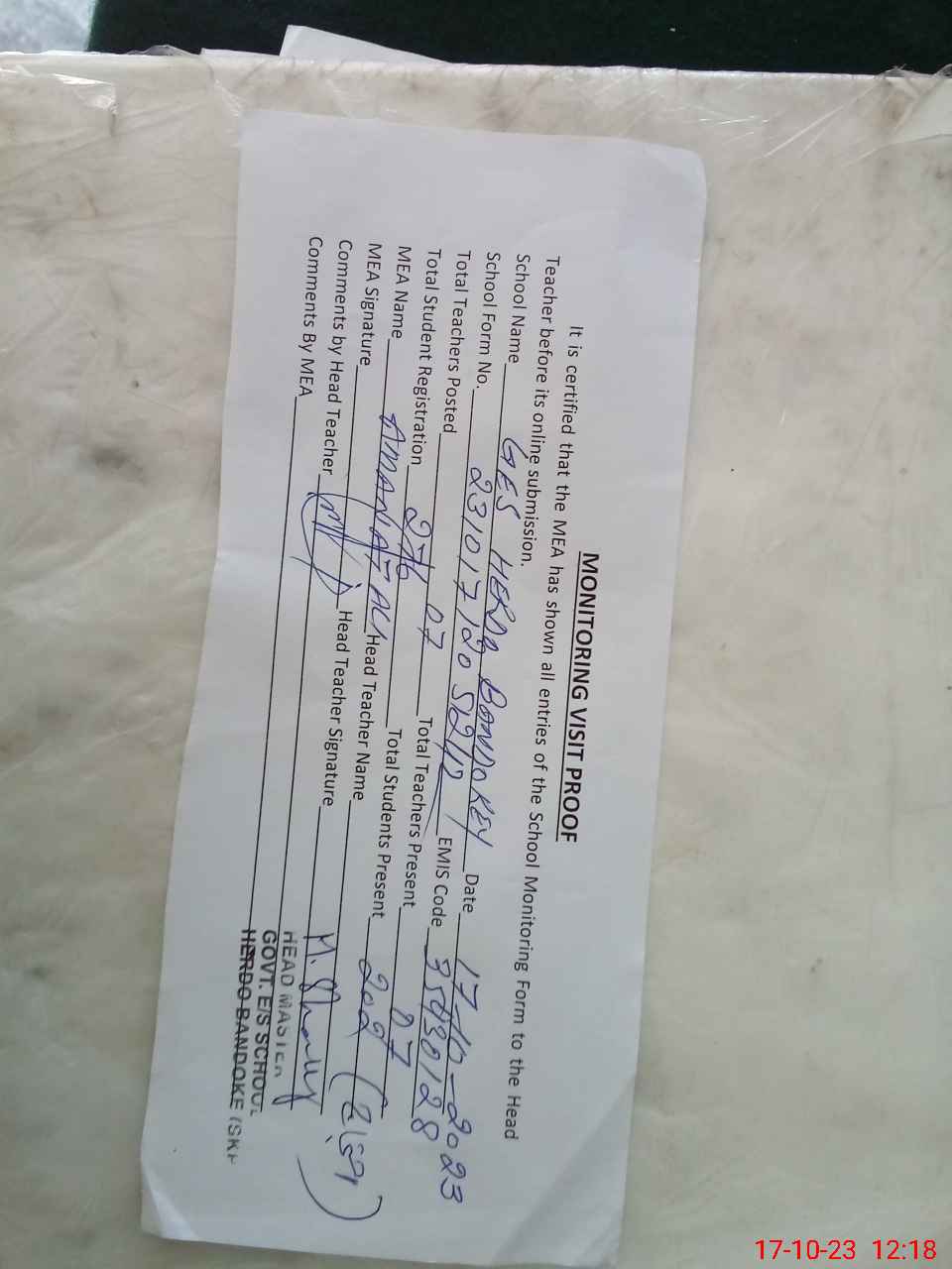 | Attendance Register | Head Teacher | MEA with School | Visit Proof |