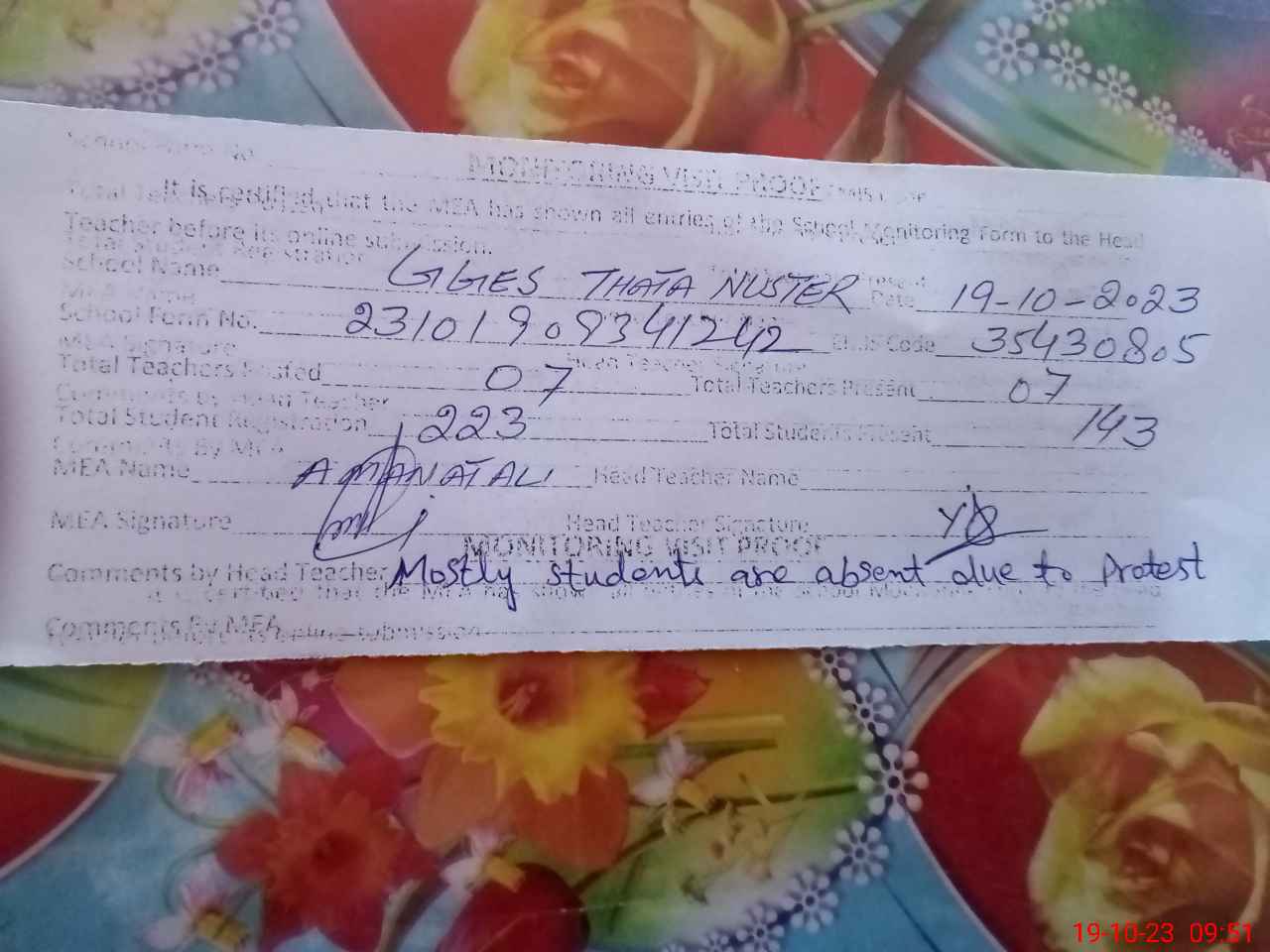 | Attendance Register | Head Teacher | MEA with School | Visit Proof |