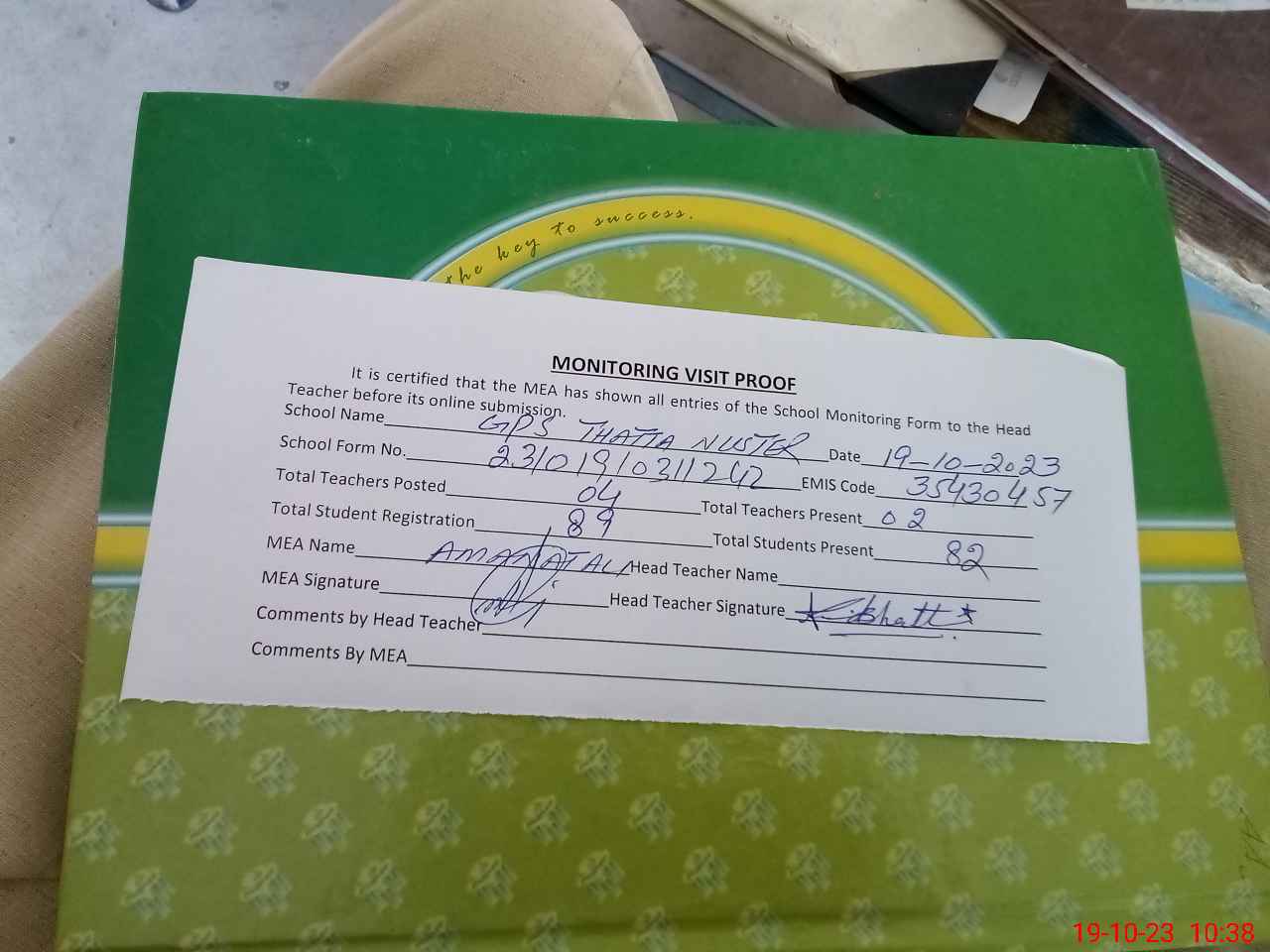 | Attendance Register | Head Teacher | MEA with School | Visit Proof |