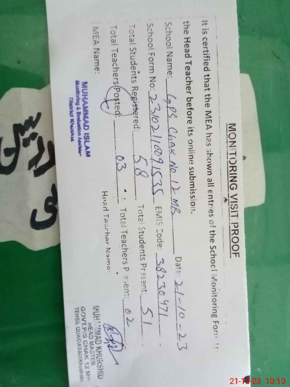 | EMIS Code: 38230471 | Name of School: GPS CHAK NO. 12 MB | |||