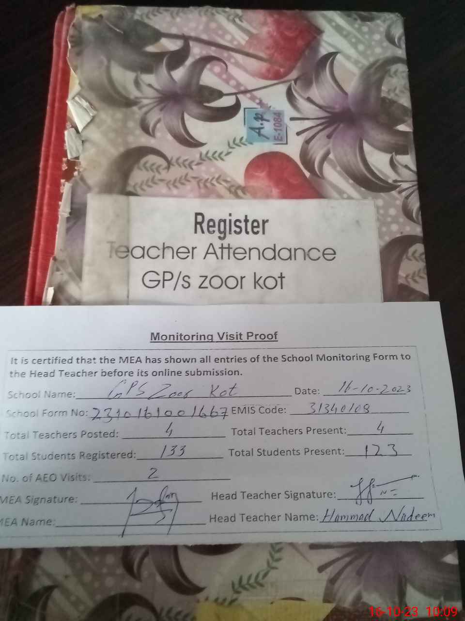 | Attendance Register | Head Teacher | MEA with School | Visit Proof |