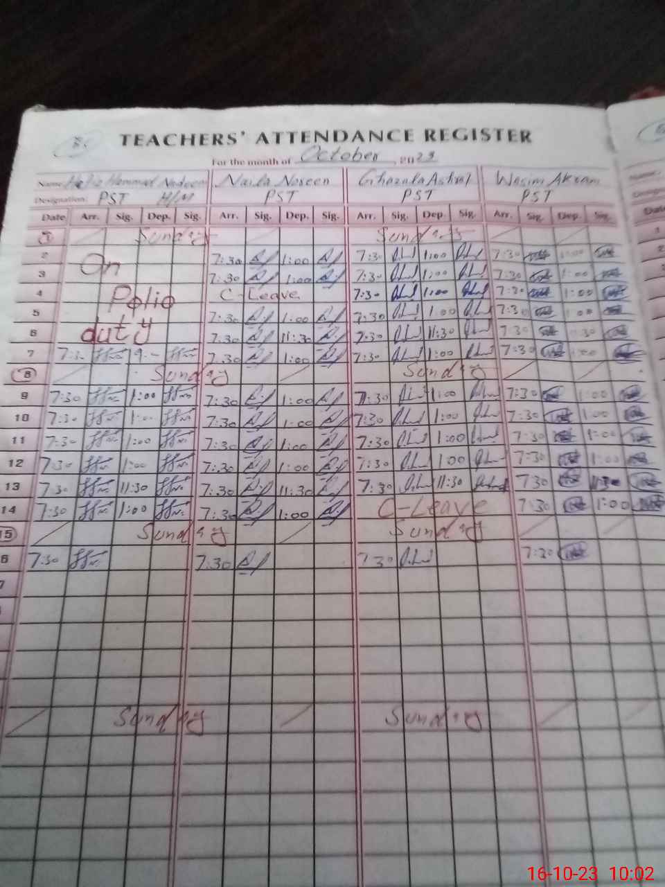 | Leave | Duty | Absent | Maternity | Medical | Ex- Pak |
