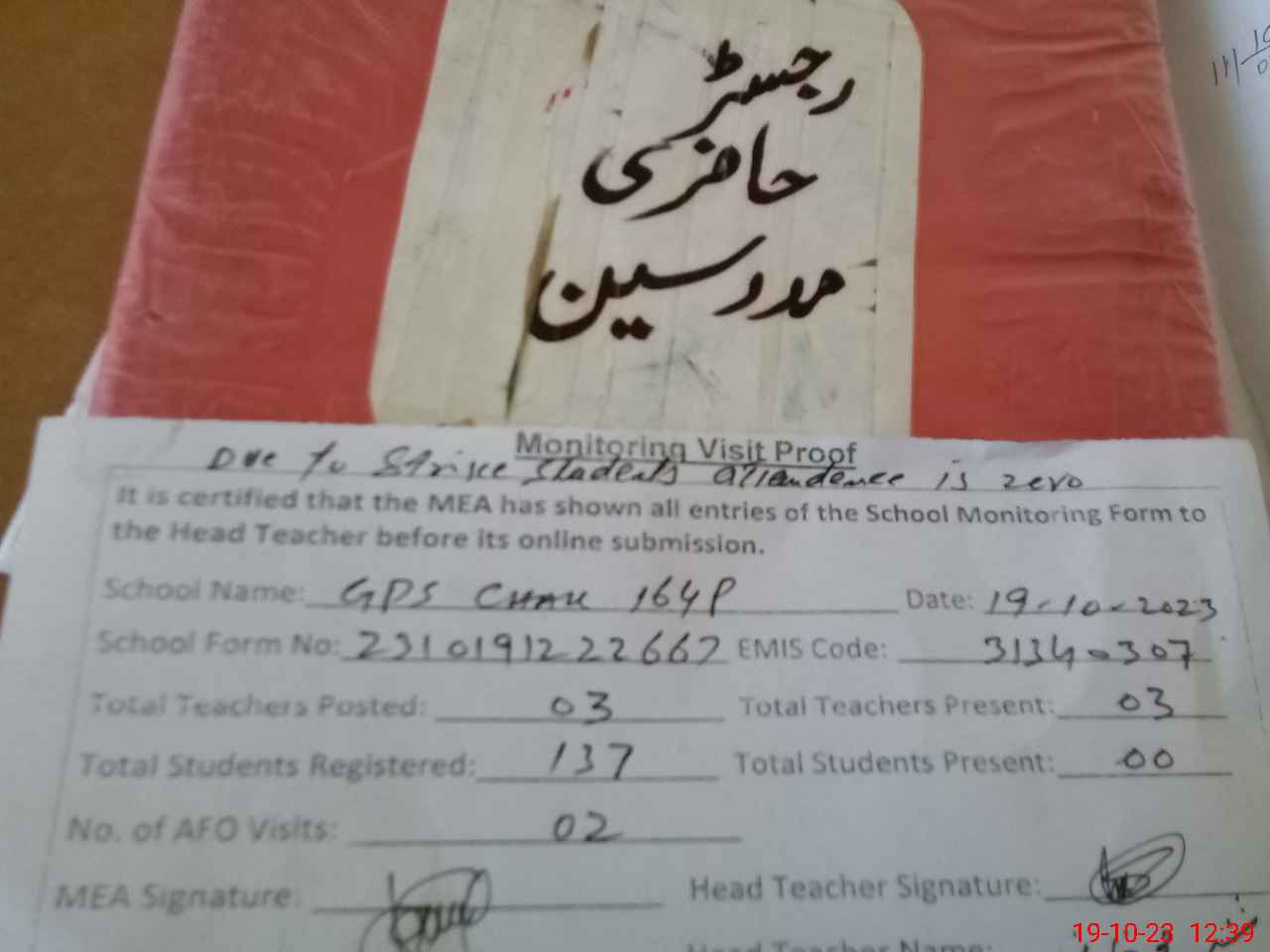 | Attendance Register | Head Teacher | MEA with School | Visit Proof |