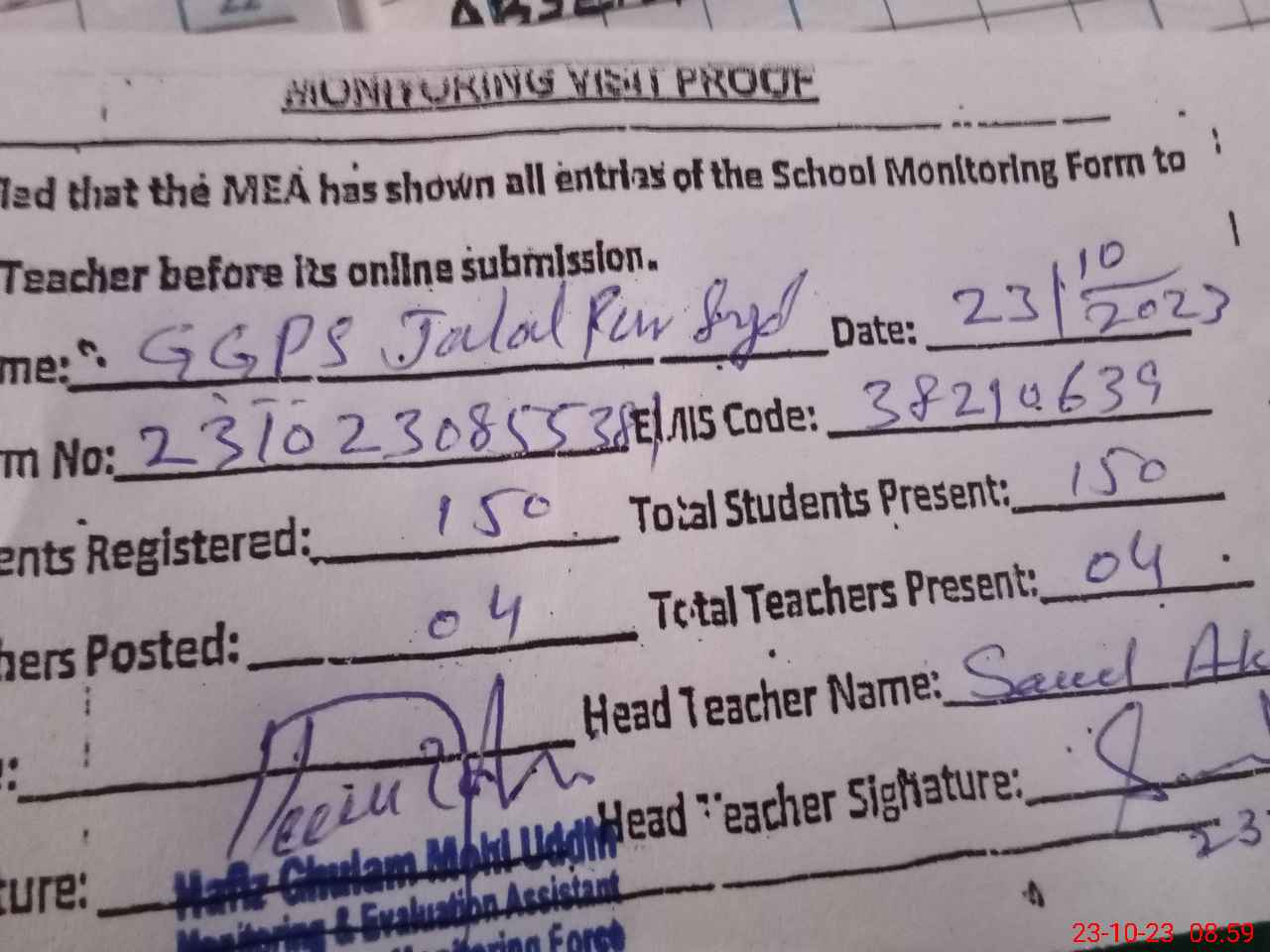 | Attendance Register | Head Teacher | MEA with School | Visit Proof |