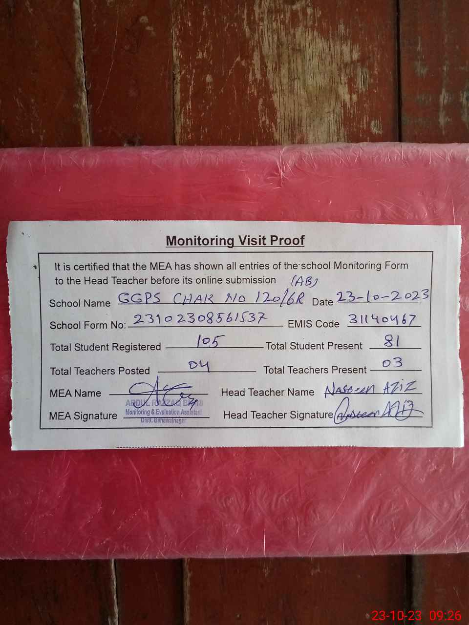 | EMIS Code: 31140467 | Name of School: GGPS CHAK NO 120/6-R B | |||