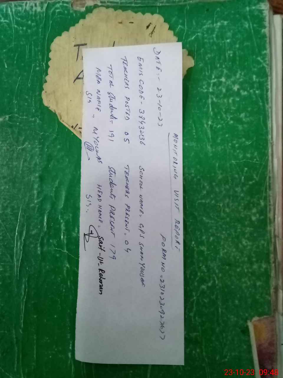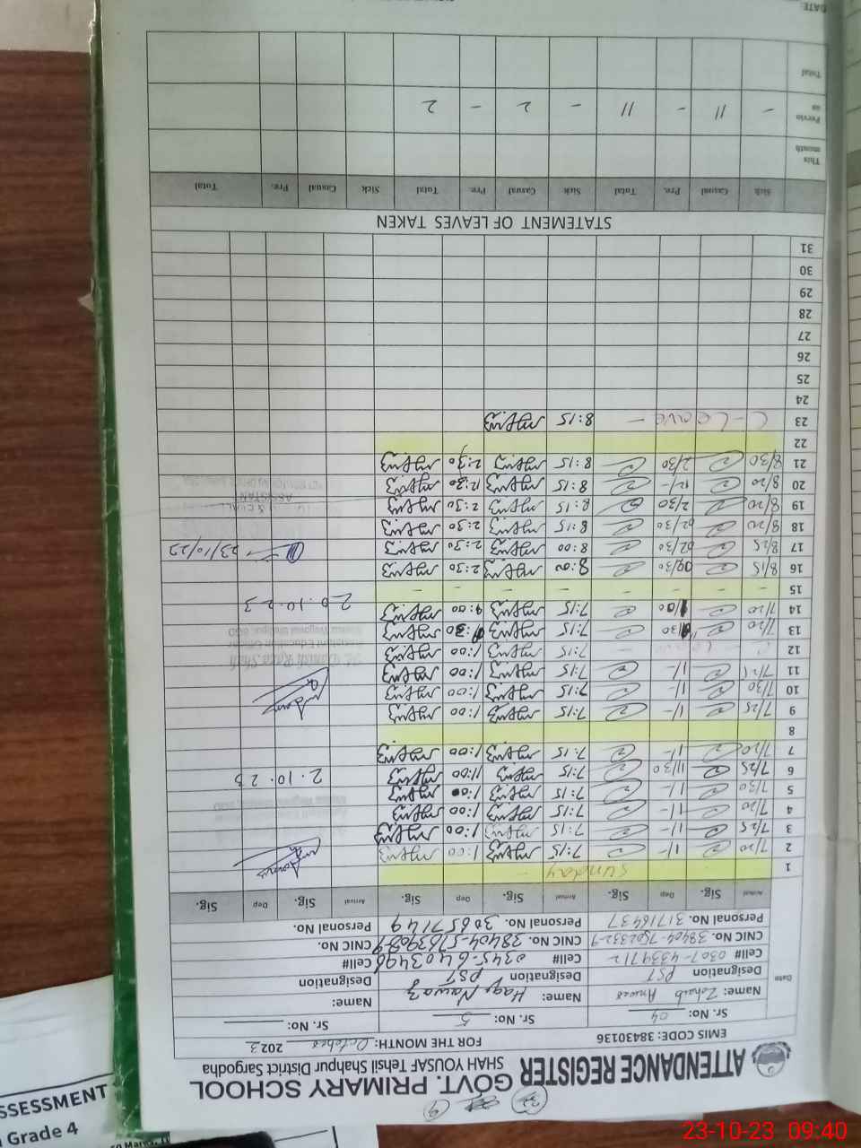 | Name: SA**** URRE**** Designation: (School Headmaster's/Headmistress's) PST Phone/Cell Number: 03**** |