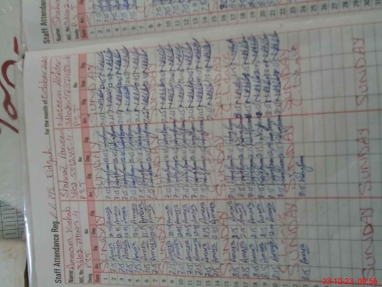 | CNIC | Full Name | Designation | R/C | Absence During Last Calender Month |