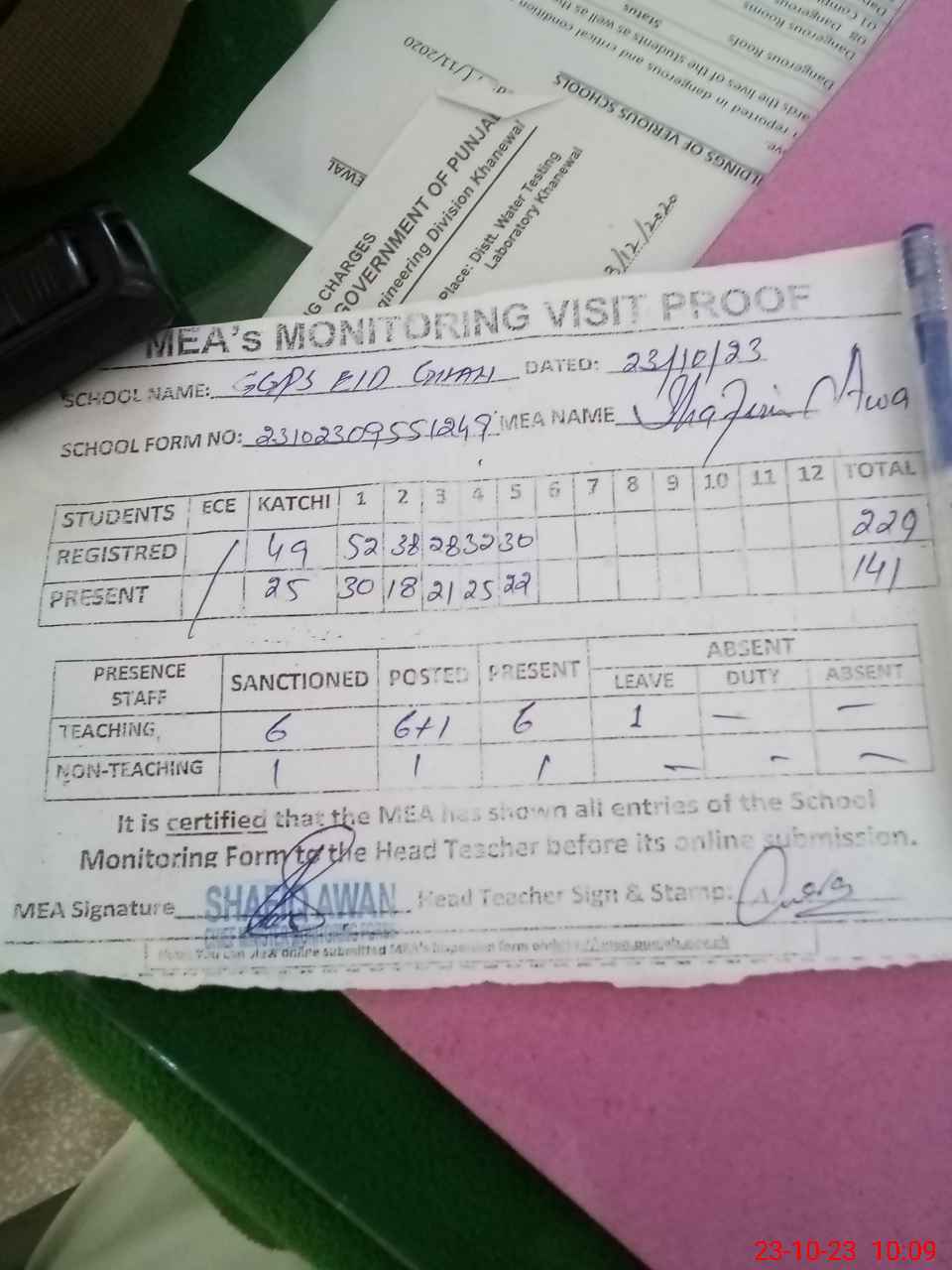 | Attendance Register | Head Teacher | MEA with School | Visit Proof |