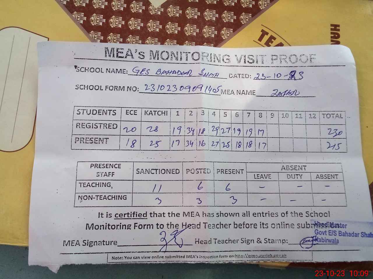 | Attendance Register | Head Teacher | MEA with School | Visit Proof |