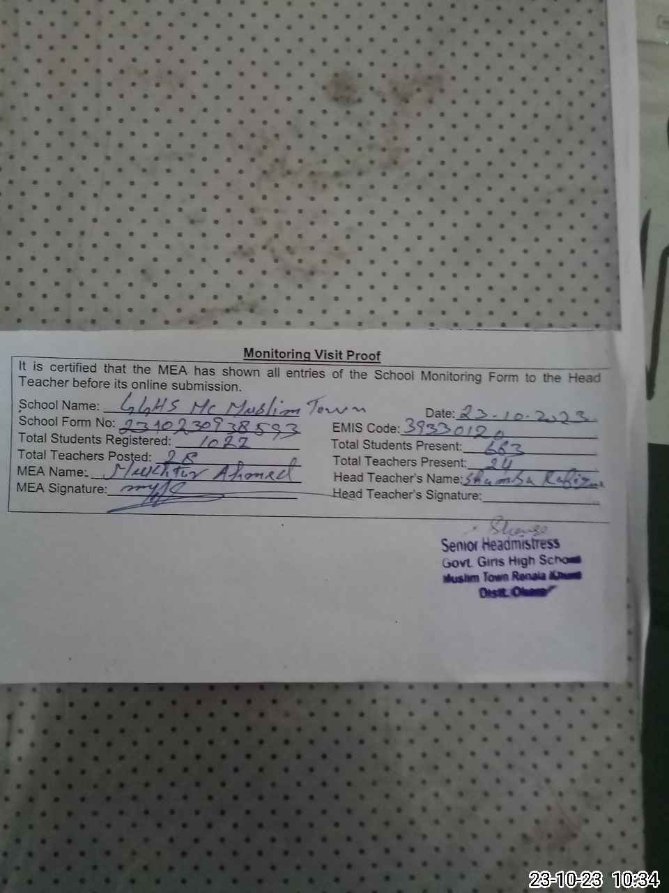 | Attendance Register | Head Teacher | MEA with School | Visit Proof |