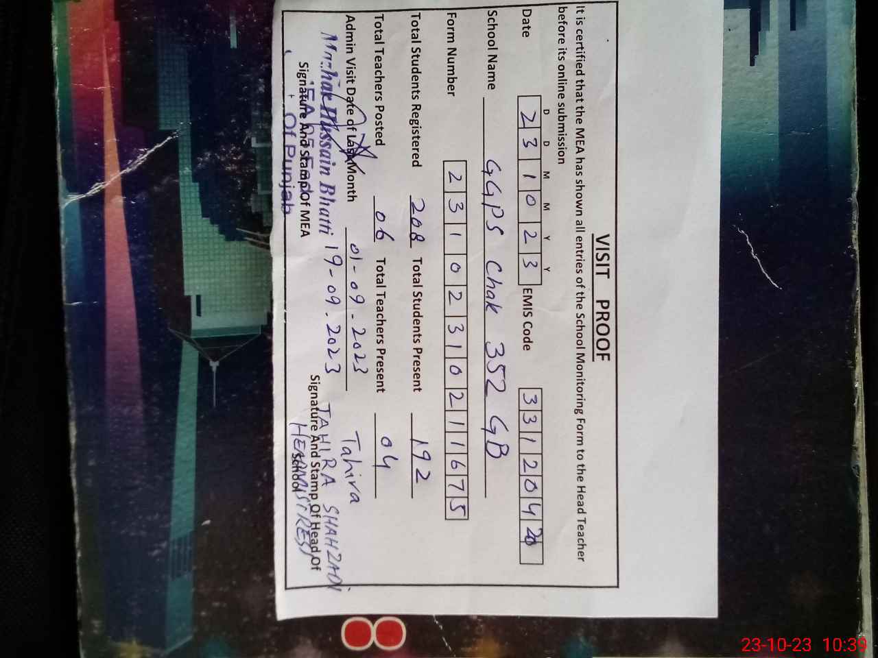 | Certified that this School was Inspected by the Undersigned MEA/DMO Today and the Information Stated Above is as Per Record. | |||||