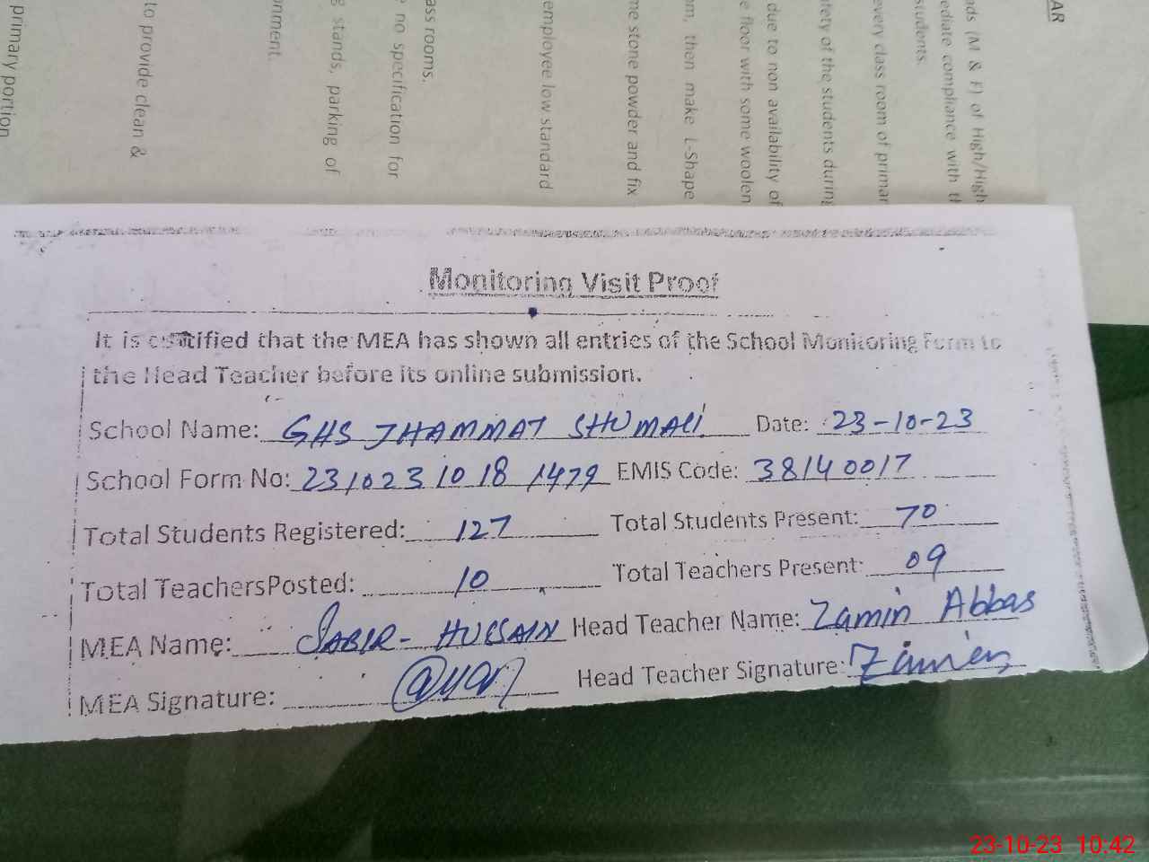 | Attendance Register | Head Teacher | MEA with School | Visit Proof |