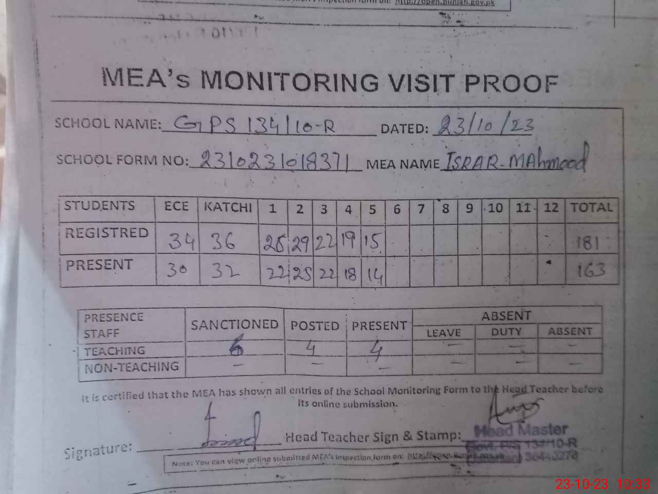 | Attendance Register | Head Teacher | MEA with School | Visit Proof |