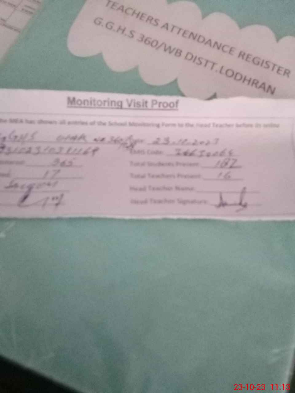 | Attendance Register | Head Teacher | MEA with School | Visit Proof |