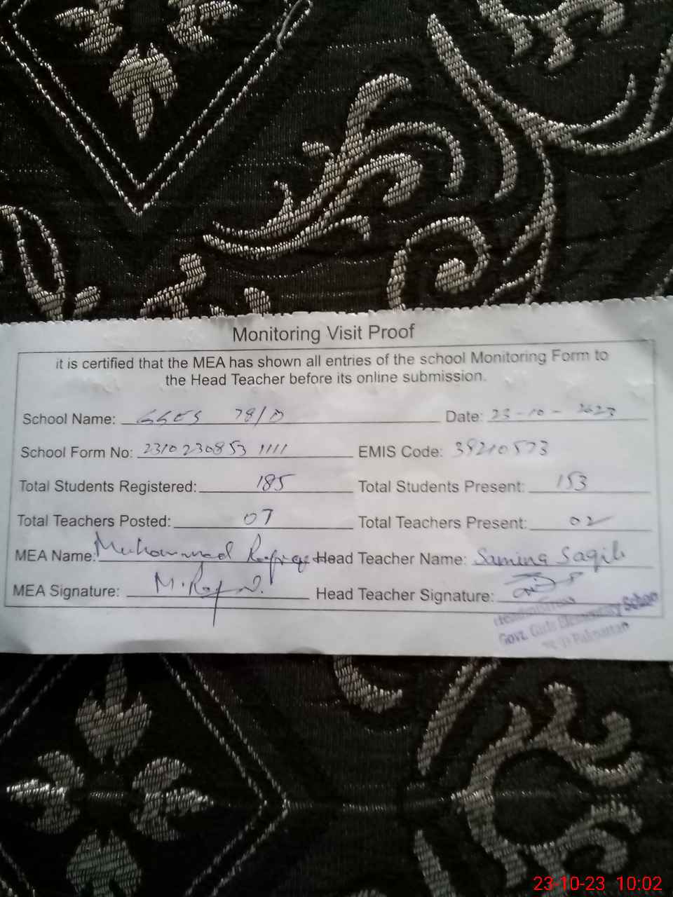 | Certified that this School was Inspected by the Undersigned MEA/DMO Today and the Information Stated Above is as Per Record. | |||||