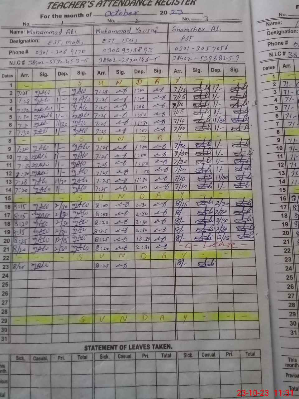 | CNIC | Full Name | Designation | R/C | Absence During Last Calender Month |