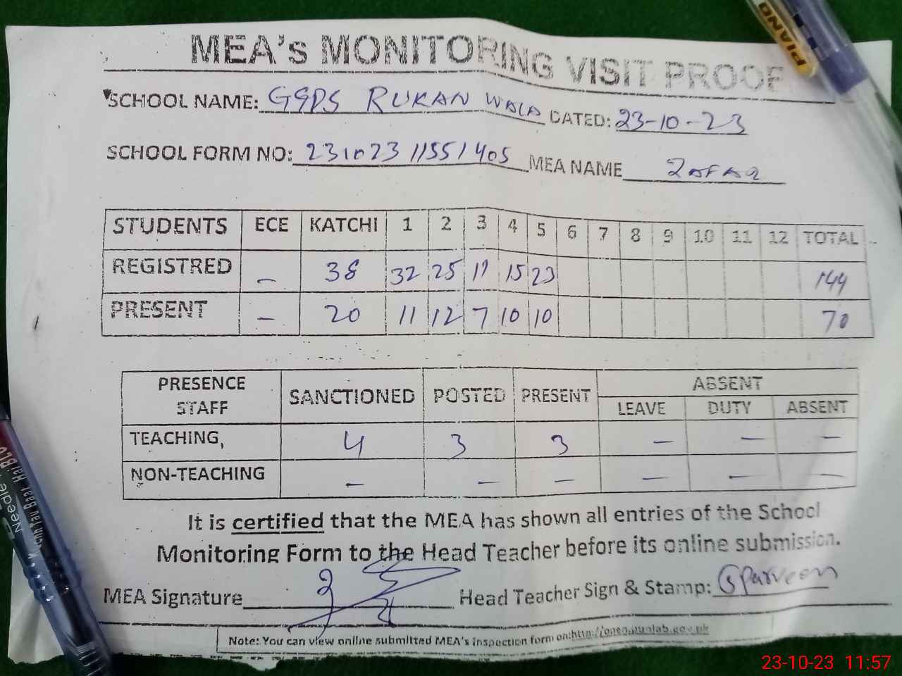 | Attendance Register | Head Teacher | MEA with School | Visit Proof |