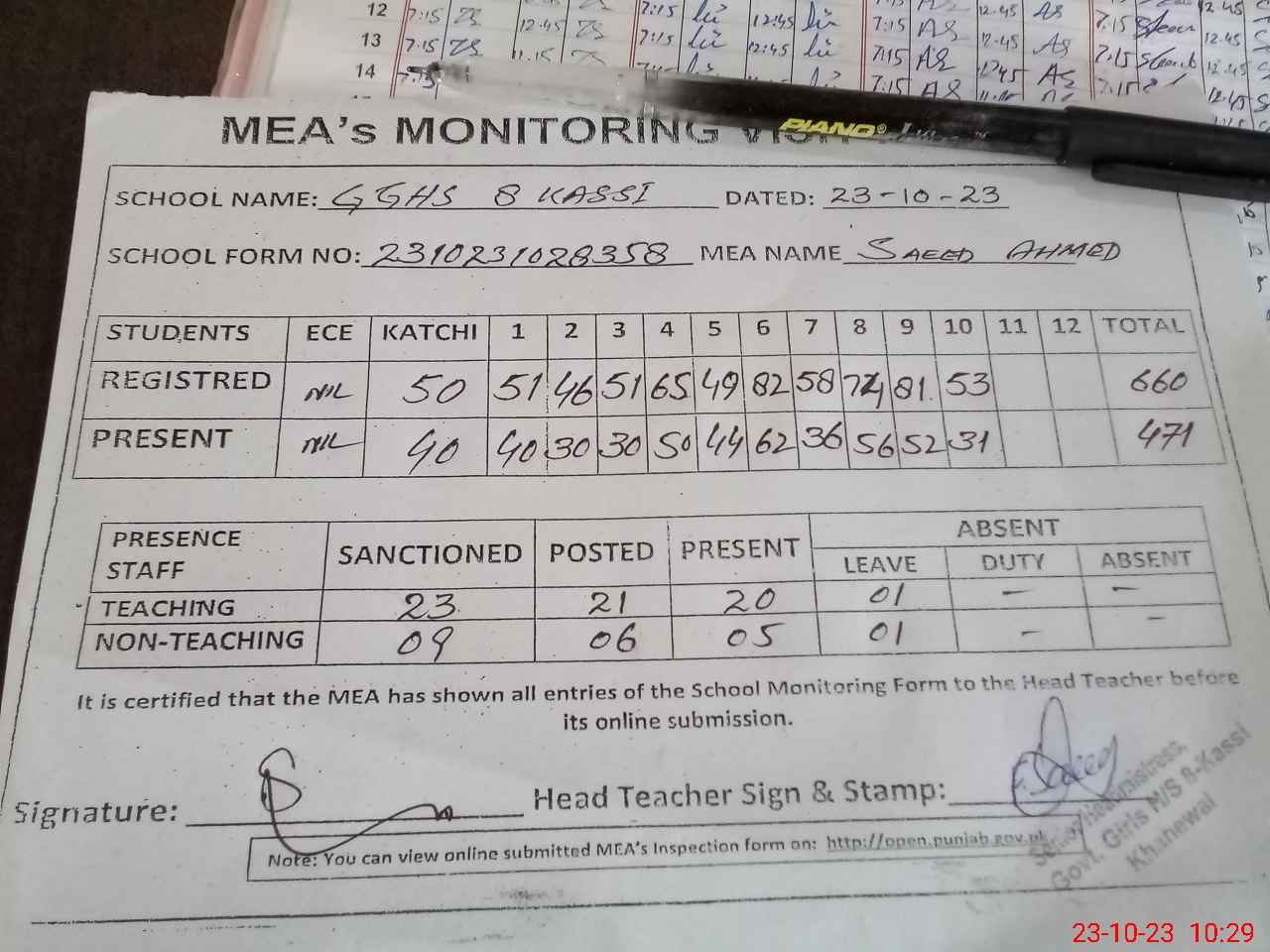 | Monitoring Date: 23-10-2023 | Start Time: 23-10-2023 09:34 AM | End Time: 23-10-2023 10:51 AM | Name of MEA: Sa**** Ah**** | |