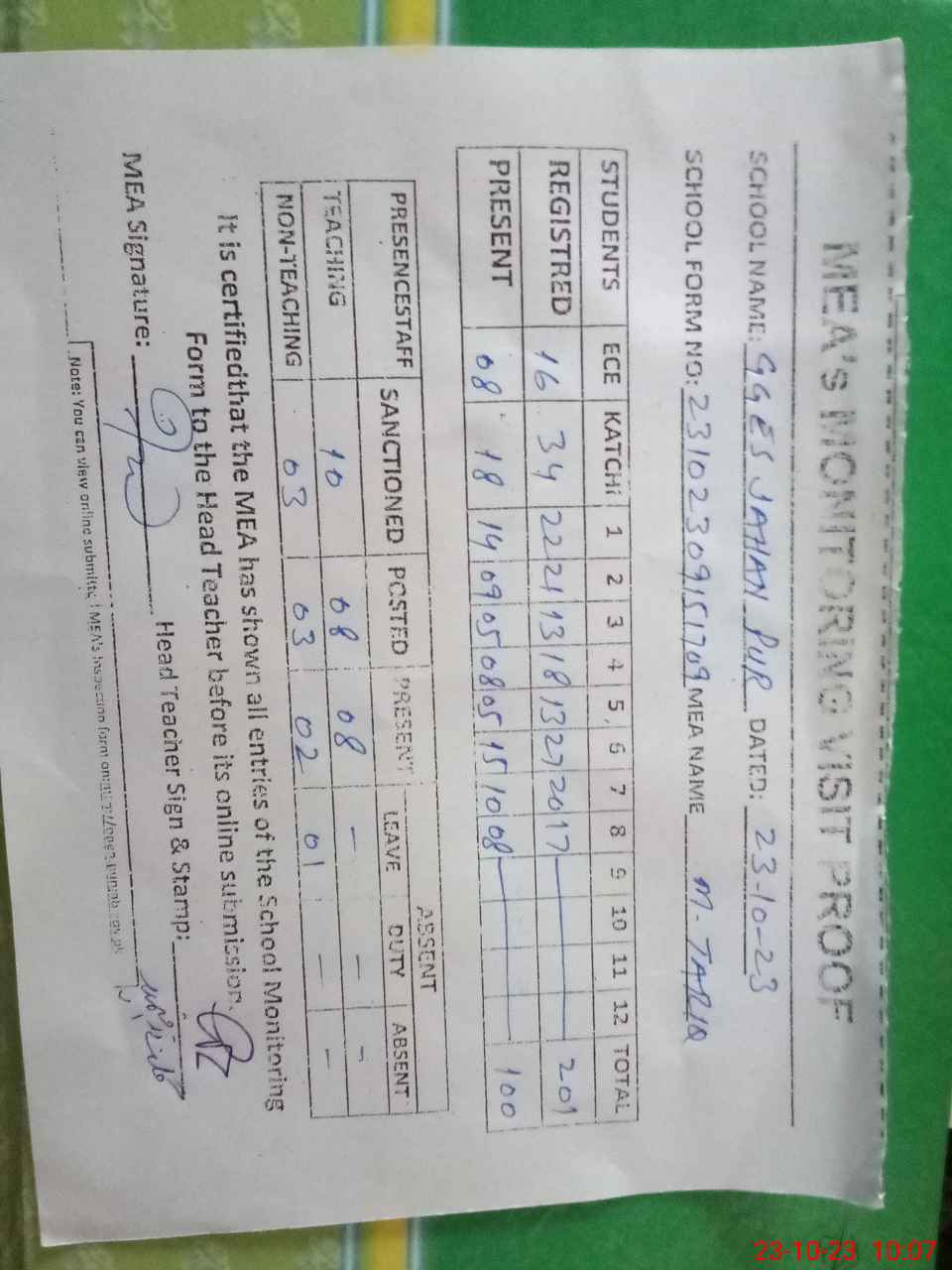 | Attendance Register | Head Teacher | MEA with School | Visit Proof |
